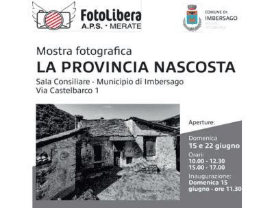 18 Giugno, 2025Mostra fotografica di FotoLibera A.P.S. “La Provincia Nascosta” Dove : A Imbersago nel palazzo comunale Qua...