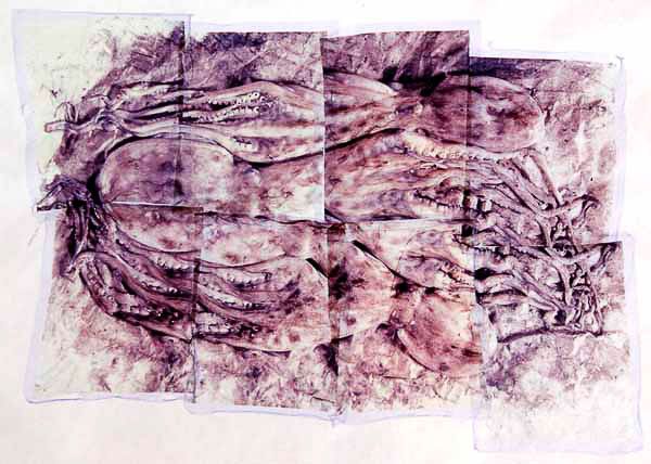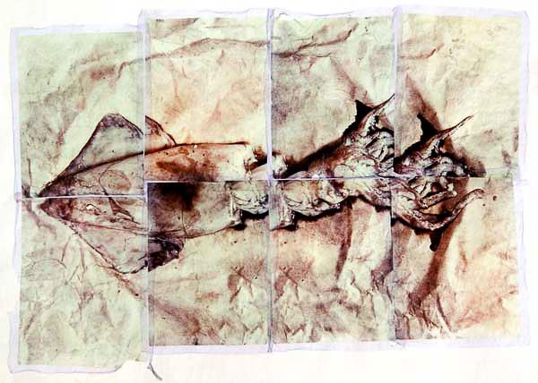 Una decina di ” emulsion lift polaroid “a tema ittico intitolate “fossili futuribili”incorniciate e appese ad un muro o a qualsiasi supporto.
