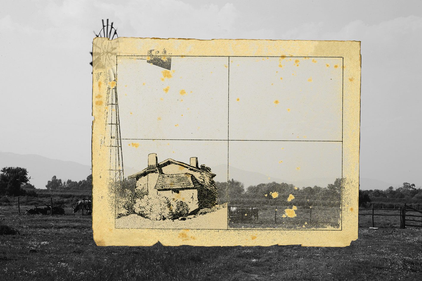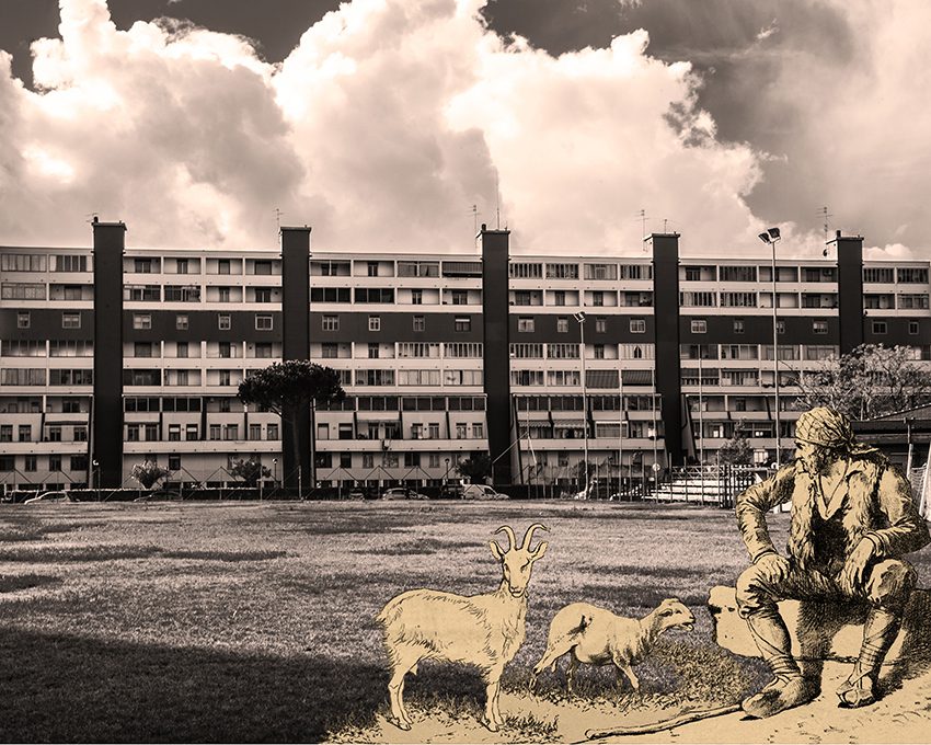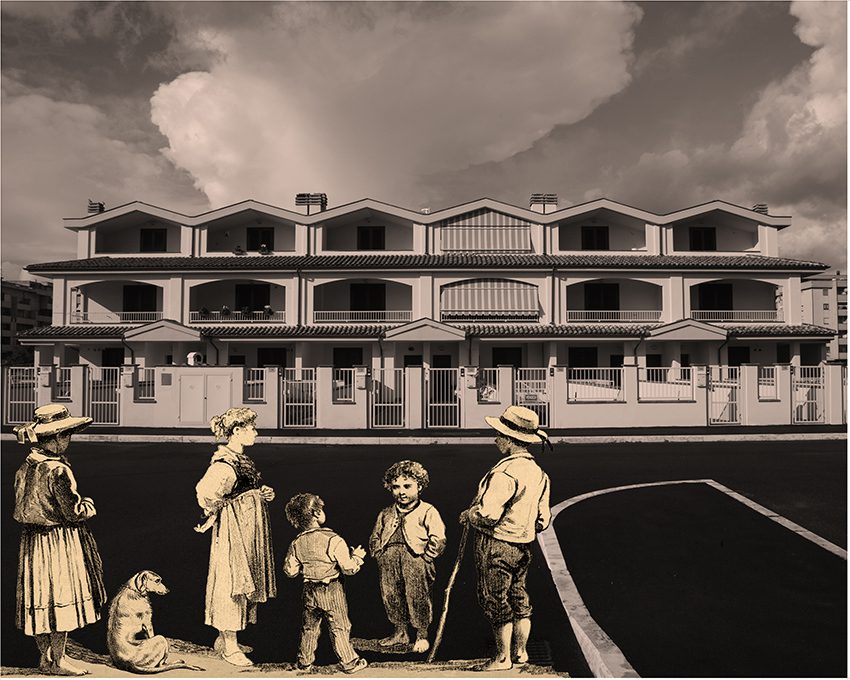 Cours progressif de paysage: Questo progetto è la naturale conseguenza di vivi ritirato e nella quiete e sii selvaggio. Dopo immagini bucoliche e paesaggi incontaminati ho pensato di utilizzare fotografie di deprimenti edifici della periferia di Grosseto – poco importa il nome della città – e, contemporaneamente, di dare un messaggio di serenità e di familiarità tramite rassicuranti personaggi inseriti nel contesto.
